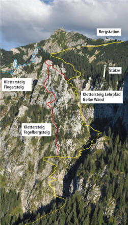 Ab Tegelbergbahn-Talstation halten Sie sich in Richtung Gelbe-Wand-Klettersteig, von dem der Tegelbergsteig abgeht. Durch senkrechte Felswände, über Platten, durch Verschneidungen und über Felsbänder wird der markante Felszapfen des Gelbewandschrofens überstiegen.