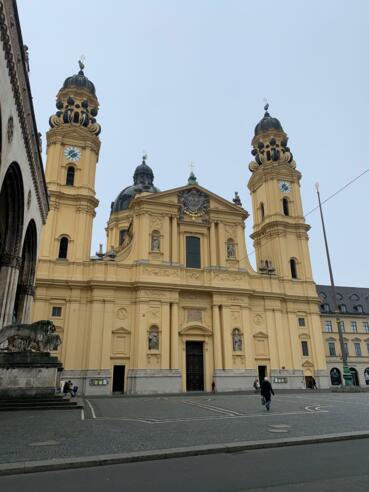 Die imposante, hellgelbe Theatinerkirche im italienischen Stil des Spätbarocks stammt aus dem Ende des 17. Jahrhunderts.