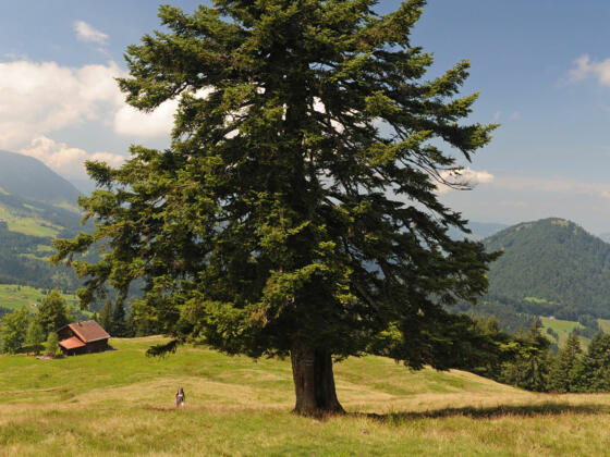 Beim Aufstieg zum 1.411 Meter hohen Renkknie bieten sich immer wieder herrliche Ausblicke auf die Berge des Bregenzerwaldes und des Naturparks. Sehenswert ist auch die alte Weißtanne, die in Gipfelnähe mitten auf einer Alpweide steht.