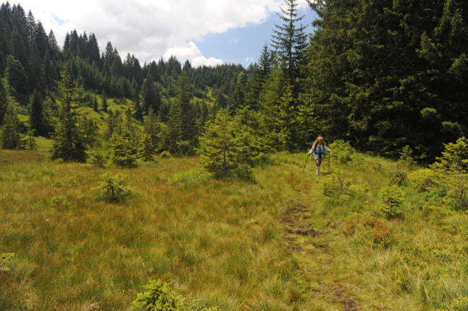 Hier lohnt sich ein Abstecher ins wildromantische Naturmoorbad. Über das aussichtsreiche Renkknie führt die Wanderung zur Hochriesalpe und – durch einen sehenswerten Bergwald – weiter zur Neuburgalpe. Danach geht es über mehrere Moorwiesen und Hochstaudenfluren mitten hinein ins Rutschgebiet unterhalb des Feuerstätterkopfes. Hier ist beim Abstieg zur Lustenauer Riesalpe etwas Trittsicherheit gefragt.