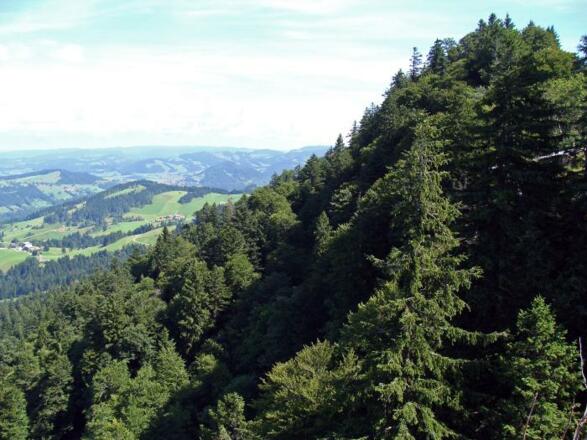Die Rundwanderung zum Kojen vereint vieles von dem, was den Naturpark so wertvoll macht. Sie beginnt in dem kleinen, traditionell geprägten Ort Riefensberg und führt zunächst bergauf durch einen naturnahen Bergmischwald. Das Steinerne Tor markiert den Übergang auf die Hochfläche des Häderichmoores. Zunächst führt der Weg am Grat entlang zum Kojenstein, der mit 1.300 m Höhe einen guten Überblick über die Landschaft des Vorderwalds und der Nagelfluhketten gibt. Von dort steigt man wieder knapp 100 Höhenmeter zur Hochfläche ab und quert am Hangfuß zum Alpstüble Moos. Hier schließt sich eine eindrucksvolle Rundstrecke durch das Häderichmoor an. Über das Steinerne Tor geht es zurück nach Riefensberg.