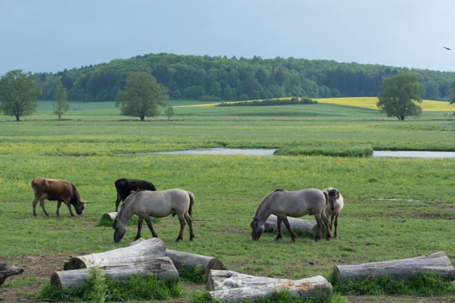Seit 2004 erobert sich hier die Natur ein 70 Hektar großes Stück Landschaft zurück. Mittlerweile ist die Hutelandschaft Rodachaue wieder das, was sie vor der Ankunft der Menschen war! Auen, in denen Störche reichlich Futter finden. Wiesen, auf denen wilde Pferde und Rinder weiden. Ein großartiges Fenster zurück in eine Zeit, in der die Erde noch den Tieren gehört hat.