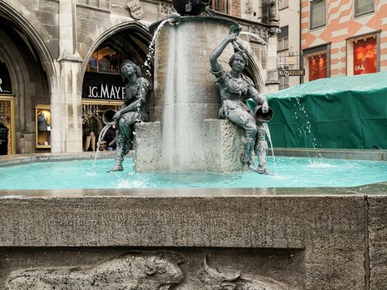 Hier kann man rumschauen: am Marienplatz haben wir noch zwei wichtige Punkte. Zuerst gehen wir zum Zentrum des Platzes, zur Mariensäule, die man nicht übersehen kann. Am Sockel der Seule kann man vier Heldenputti sehen, die gegen vier Schrecken kämpfen. Für uns ist der Heldenputti interessant, der sein Schwert über einem Basilisk ( vermischte Hahn und Schlange) schwingt. Der Basilisk erinnert sich an eine der schlimmstem Pestwellen in München im 17. Jahrhundert.