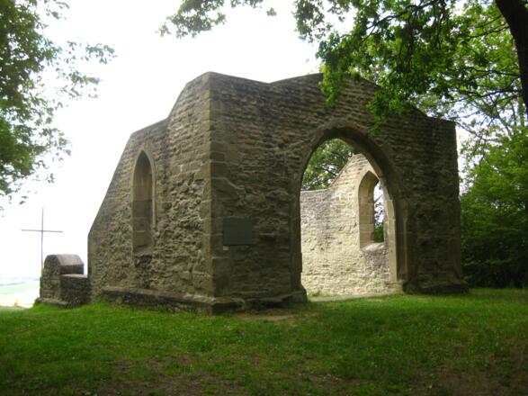 Ausgangsort Hüttenheim: Zugang ab dem Wanderparkplatz am Fuße des Tannenbergs. Mit einem kleinen Anstieg geht es zum Startpunkt an der Wanderhütte am jüdischen Friedhof (1), den Hüttenheimer Tannenberg hat man dann rechts im Blick. Der historische Herdweg (2) führt entlang schöner Hecken, Felder und Streuobstwiesen zur 8-Dörfer-Eiche (3). Danach steigt der Weg durch Seinsheimer Holz auf den Kapellberg an. Die Route folgt dem Steigerwald-Panoramaweg durch den Wald über den Bullenheimer Berg zur Ruine der Kunigundenkapelle (4). Hier belohnt ein herrlicher Ausblick. Infotafeln erzählen von der Geschichte des Ortes. Weiter geht es über ein Stück des Weinparadiesweges, es bietet sich eine Rast in der Weinparadiesscheune (5) an.