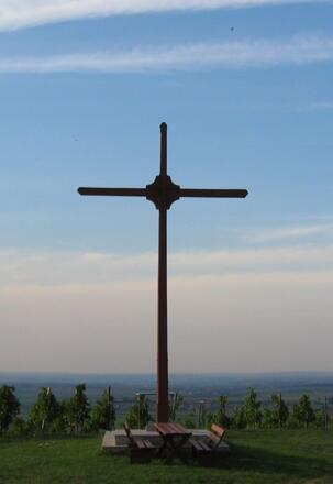 Durch den Taleinschnitt steigt der Weg auf das Plateau des Hüttenheimer Tannenbergs hinauf. Hier eröffnet sich ein grandioser Rundblick über das Weinparadies und in die fränkische Landschaft. Ein beliebter Rastplatz ist das Kreuz am Tannenberg (9), welches zur Erinnerung an die Wiedervereinigung Deutschlands errichtet wurde. Durch ein kleines Wäldchen geht es zurück nach Hüttenheim.