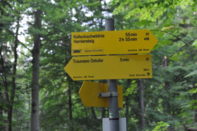 Am Startpunkt beginnt der Hans- Hernler- Steig bei einem Bründl gegeüber einer Badezone etwa 1 km nach dem Gasthaus Hois'n und 0,5 km vor dem Umkehrplatz. Hier sind ausführliche Hinweistafeln sowie der Übersichtplan des Klettersteiges zu sehen. Durch ein Waldstück geht es bis zu einer Forststraße,die man quert und an der nächstes Kreuzung rechts weiter (links geht es in die Kaltenbachwildnis, siehe Tour http://www.alpenvereinaktiv.com/de/r/8012166). Ab hier geht es eindeutig weiter, vorbei am Dreibrüderkogel, mit Blick auf den fast vom Absturz bedroht wirkenden Brandkogel geht es weiter zu den Leitern, langsam beginnt sich der alpine Charakter des Weges abzuzeichnen und besonders wenn der Weg nicht ganz trocken ist, benutzt auch der geübte Berggeher gerne die Sicherungsseile. Wir passieren den "Muarlwald", später den Dachsteinblick, der an klaren Tagen einen Blick auf die Gletscher verspricht. Die ist etwa die Hälfte des Weges, bald verlässt man den Waldbestand, vorbei geht es am "Weinmanntaferl" in den "Brandgraben", weiter zur "Hohen Rast". Ab hier wird der Bergsteiger mit Blicken in die Weiten Oberösterreichs belohnt. Weiter geht es ein Stück durch den Brandgraben, wir queren nach links und streben an der nun fast durchgehenden Seilsicherung empor bis zum Abzweig des Klettersteigs auf etwa 1500m Höhen. Über ein Felsband und einen gut gesicherten Aufschwung kommen wir auf die Nordseite wo wir ermutigt durch das Schild "noch 10 Mintuen zur Hütte" über den Käshofergraben das Gipfelplateu erreichen. Links geht unschwierig es weiter zum Gipfel. Am Rückweg lädt die Gmundner Hütte zur Einkehr ein. (Option: Hier könnten wir uns auch für einen Abstieg über den Hernlersteig entscheiden). Mit Blick auf Ebensee geht es durch wechselnd breiten Latschengassen bergab zum Beginn des Mairalmsteiges. (Option: Hier können wir uns auch für einen Abstecher zum Naturfreundehaus oder Abstieg über den Naturfreundesteig entscheiden). Zuerst noch vielfach seilversichert, geht es rasch bergab in der Süd-Südostflanke. Anfangs sehen wir noch in das Tote Gebirge, der Tiefblick in das Lainautal ist noch frei. Wir queren immer wieder kleine Felsbänder und steigen einige Stufen hinab, um nach einiger Zeit auf das Bründl treffen. Wir verlieren weiter rasch an Höhe, der Weg wird streckenweise flacher und führt uns endlich beim "Kaisertisch" über den Lainaubach auf die Mairalm- Forststrasse. (Option: Hier lockt ein Besuch in der Mairalm). Der Forststraße folgen wir bergab Richtung See bis zur Brücke. Option: Hier können wir über den Miesweg am See entlang zurückgehen (Einstieg vor der Brücke links). Etwas schneller geht es am Einstieg des Naturfreundesteiges vorbei durch die Tunnels zum Umkehrplatz und weiter zum Parkplatz.
