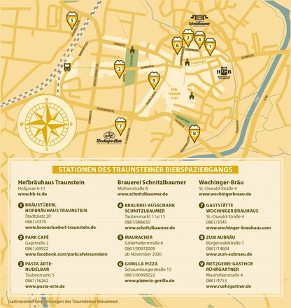 In Traunstein waren es bis ins 19. Jahrhundert neun Brauereien die das "beste Bier" brauten. Noch heute führen drei Traunsteiner Bierbrauer diese Tradition fort: der Wochinger Bräu, die Brauerei Schnitzlbaumer und das Hofbräuhaus Traunstein.