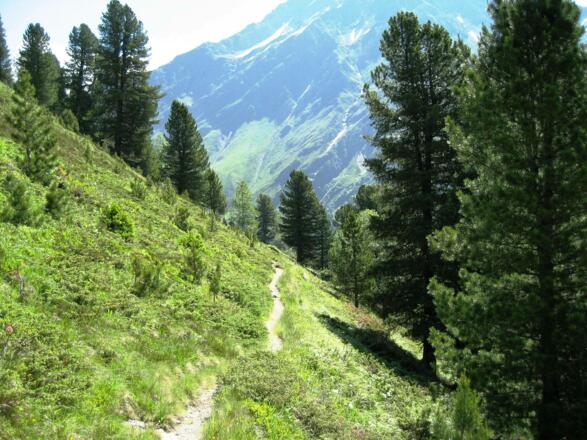Zunächst folgt man dem gut ausgeschilderten Hüttenzustieg des Westfalenhauses (Weg 141) nach Nordwesten, der unterhalb der Süostflanke der Schöntalspitze in einer langen Querung bergab führt. Der Weg führt in die Latschenzone, wendet sich dann nach Norden und man gelangt zu einer Gabelung, wo man sich rechts hält. Nun durch lichten Bergwald absteigend ignoriert man eine weiter Abzweigung nach links, überquert einen Bach und stößt auf einen Fahrweg, der zum Alpengasthof Lüsens führt. Noch bevor man diesen erreicht, überquert man mittels einer Brücke den Talbach. Auf der anderen Seite geht man einst Stück nach rechts.
