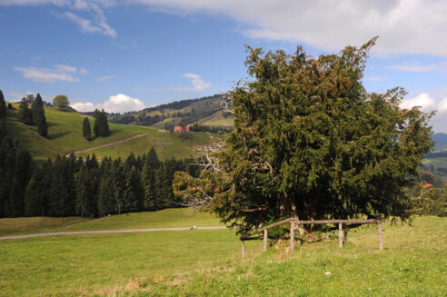 Der älteste Baum im Alpgebiet bei Steibis wirkt auf den ersten Blick recht unscheinbar. Es ist eine alte, verwitterte Eibe, die ihre knorrigen Äste und Zweige nur wenige Meter in den Himmel reckt. Sie steht auf der Alpweide oberhalb der Unteren Lauchalpe – und stand dort wohl
