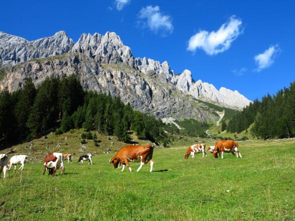 Wir wandern zurück zum Rohrmoosbauer (Weg Nr. 65/66) - alternativ besteht auch die Möglichkeit mit dem Wanderbus Maria Alm bis zur Haltestelle Alpinpark zu fahren. Ab dem Rohrmoosbauer halten wir uns in Richtung Pichlalm (Weg Nr. 67) und gelangen wieder auf den Fernwanderweg Nr. 401A/436. Vorbei an der Pichlalm gelangen wir auf einem Wiesensteig durch sehr feuchte Almflächen in ein Waldstück und auf wurzeligem Pfad durch einige Gräben und Schluchten. Nach etwa 1/2 Stunde erreichen wir wieder einen breiten Wanderweg, der nach kurzer Zeit steil abwärts in Richtung Hinterthal führt - vorbei an der Mußbachalm und der Aueralm. Wir wandern auf der Hochkönigstraße durch Hinterthal, queren die Hochkönig Bundesstraße und gelangen zur Hochmaisalmbahn. Wir überqueren den Parkplatz und gelangen am Ende auf einen idyllischen Wanderweg entlang der Urslau, bis wir wieder die Hochkönig Bundesstraße erreichen. Wir folgen der Bundesstraße ein kurzes Stück wieder in Richtung Hinterthal und halten uns schließlich links auf dem Güterweg zum Pichlbauer. Vorbei am Bauernhof wandern wir erst über einen Wiesenweg und schließlich wieder einem Wanderweg kurz steiler bergauf bis wir zum Jufensattel gelangen und das Berghotel/-restaurant Jufenalm erreichen. Der Weg führt an der Jufenalm vorbei, ein kurzes Stück die Jufenstraße entlang und nach einer Holzgarage nehmen wir rechts den Walderlebnisweg. Nach der 3. Station des Themenweges halten wir uns rechts und folgen dem Natrunhöhenweg (Weg Nr. 401A/436 steil bergauf. Ein wurzeliger Weg führt uns durch Wald, über freie Lichtungen mit herrlichen Ausblicken über die Natrunhöhe und nach etwa 1/2 Stunde wieder auf den Walderlebnisweg. Wir folgen dem Weg vorbei an einigen Stationen des Waldhochseilgartens bis zur Bergstation der Gondelbahn Dorfjet. Vorbei an der Station gelangen wir über den steilen Abstieg (Weg Nr. 401A) vom Natrun mit wunderschönem Blick auf Maria Alm hinunter ins Dorf. Die Gondelbahn Dorfjet erleichtert den Abstieg.