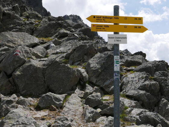 Weiter geht es, über Wiesenhänge und in einer langen Linkskurve in das Steinkar. Hier nun in Serpentinen steil empor, vorbei an der Abzweigung zur Wangenitzseehütte, bis man zum letzten Anstiegsteil mit den Seilversichrungen kommt. Über diesen unschwierig hinauf zur Niederen Gradenscharte mit dem See.