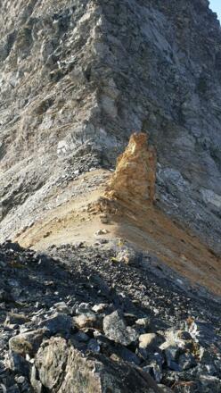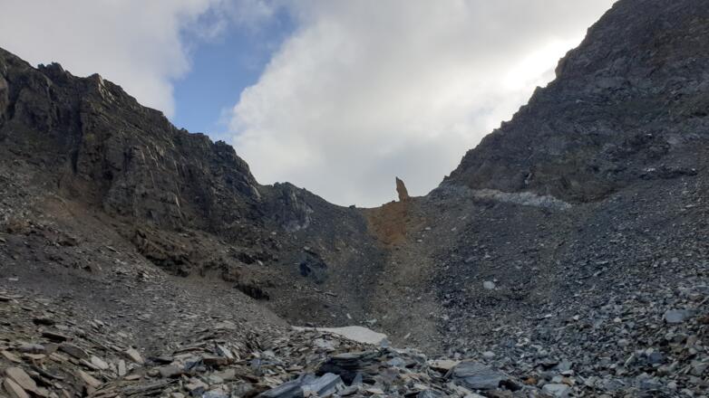 Die Weggabelung mit einem Schild befindet sich auf ca. 2500hm, ab hier erfordert der Weg etwas mehr Orientierung und Aufmerksamkeit. Das Tröl scheint von hier unbesteigbar Steil und überrascht mich dann später mit guten Felsstufen und einer kleinen Leiter als Steighilfe. Das Törl bietet eine wundervolle Aussicht und der aus der Ferne erblickte Steinmann entpuppt sich als enorm großer Fels.