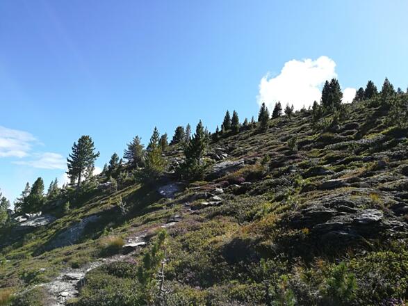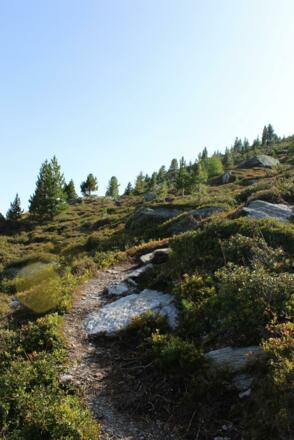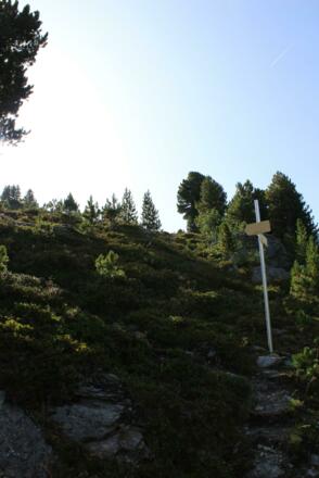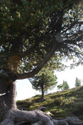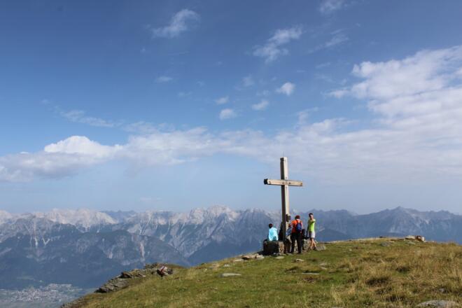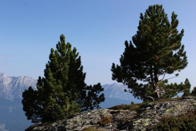 Gemütlich Gondeln wir mit der Glungezerbahn bis zur Bergstation Tulfeinalm. Von dort geht es entlang des Bergrückens des Schartenkogels immer weiter hinauf bis zum Gipfel. Der Weg geht anfangs durch einen schönen Zirbenwald, der kurze Zeit später von riesigen Felsklötzen abgelöst wird. Durch diese Felsklötze folgen wir einem unschwierigen Weg, der uns das weite Panorama genießen lässt.