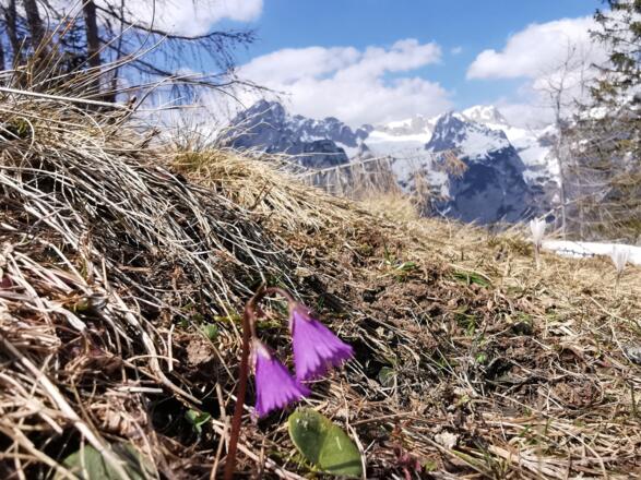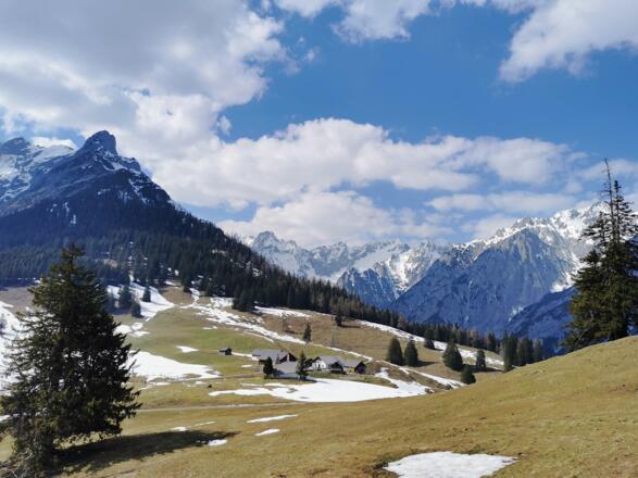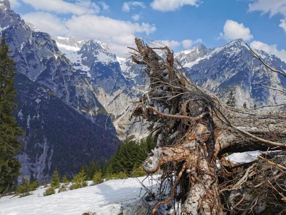 Wenn wir auf die Lichtung kommen, eröffnet sich ein traumhaftes Panorama mit den ersten Karwendelgipfeln.