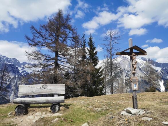 Zum Walderjoch steuern wir nicht direkt auf die Walderalm zu, sondern biegen am Martel rechts ab und gehen über Wiesen auf den Rücken. Wieder auf eine Almstraße treffend folgen wir dieser ca 10min durch den Wald, bis sich linkerhand eine Lichtung auftut. Hinauf auf diese treffen wir auf das Walder Joch mit kleinem Kreuz und Gipfelbank. Von hier schweift der Blick weit ins Inntal.