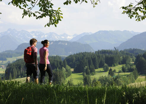 Die Wanderung beginnt am Hotel Sonnenalp und führt uns zunächst durch die Krebsbachsenke und danach etwas ansteigend zum Tiefenberger Bildstock. Auf der Höhe erschließt sich uns ein erster Rundumblick vom Wächter des Allgäus über die Grenzberge des Illertals bis zum Allgäuer Hauptkamm. Durch Tiefenberg gelangen zum Tiefenberger Moor, welches wir auf schmalen und breiten Waldwegen durchqueren. Nach Verlassen des Moorweges geht es bergan nach Dietrichs. Eine kleine Pause mit Blick auf den Allgäuer Hauptkamm lässt die ersten leichten Strapazen vergessen. Über eine kleine Anhöhe führt uns der weitere Weg über den Golfplatz zur Ortschaft Muderbolz. Kurz vor Wielenberg können wir nochmals in die Bergsilhouette des Allgäuer Hauptkamms sehen. Nahe Wielenberg verlassen wir die Straße und gehen über Waldwege zur Wittelbacher Höhe, dem höchsten Punkt unserer heutigen Wanderung. Hier erschließt sich uns nun ein abschließender Blick auf zurückgelegte Route. Nun geht es stetig abwärts, wir passieren die Ortschaft Schweineberg und erreichen hiernach das Hotel.