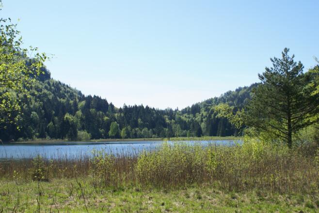 Vom Parkplatz in Alterschrofen wandern Sie auf dem geräumten Fußweg neben der Fahrstraße hinüber zum See. Dann geht es gegen den Uhrzeigersinn am Ufer entlang. Schon zu Beginn der Runde nimmt Sie ein Blick gefangen: Wie auf einem Tablett werden Ihnen die beiden Schlösser Neuschwanstein und Hohenschwangau und die markanten Felsberge dahinter serviert. Dann verschluckt Sie der Wald, am Nordufer ist es schattig. Umso mehr können Sie die sonnenbeschienenen Moorwiesen und die Blicke auf das schilfbewachsene Ufer zum Ende der Runde genießen.