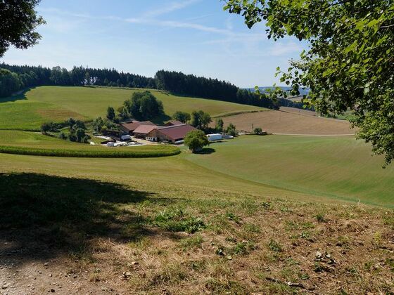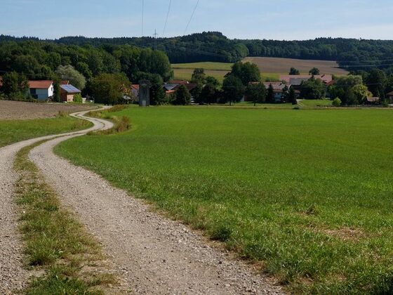 Zunächst entlang der Kreisstraße nach Oberbirnbach (schöne, alte Bauernhäuser), am Ortsende über Gasthof Tremmel leicht ansteigend durch Felder zur Hubertuskapelle. Südwärts erreicht man die Hoferhöhe von hier in Richtung Osten zurück nach Schwertling.