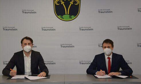 Unterzeichneten gemeinsam den Vertrag zwischen der hey.bayern UG und der Stadt Traunstein: Hans Wembacher (links) und Oberbürgermeister Dr. Christian Hümmer.