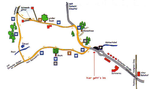 Der Wasserschmecker Rundweg ist ca. 2 km lang. Er beginnt und endet beim kleinen Parkplatz an der Eschacher Straße (am Ortsende von Buchenberg).
