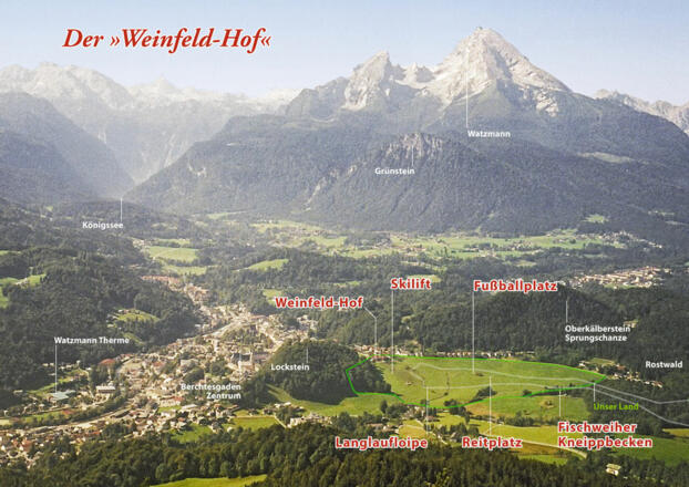 Sie wussten es genau, die Berchtesgadener Fürstpröbste, wo es in ihrem Land schön ist und dort erbauten sie schon im 14. Jhd. ihr Weinfeld. Der Weinfeld-Hof war einst fürstpröpstliche Hofmeierei. Heute finden Sie hier gemütliche Ferienwohungen am Bauernhof in ruhiger, zentraler Sonnenlage inmitten von Wiesen und Wäldern. Während des Urlaubs erleben Sie richtiges Landleben mit Kühen, Pferden, Ziegen, Hühner und Traktorfahren. Winters gibt es eine Ski-Übungswiese und Langlaufloipe direkt am Haus sowie eine Rodelbahn. Ins Ortszentrum Berchtesgadens sind es nur 8 Gehminuten.