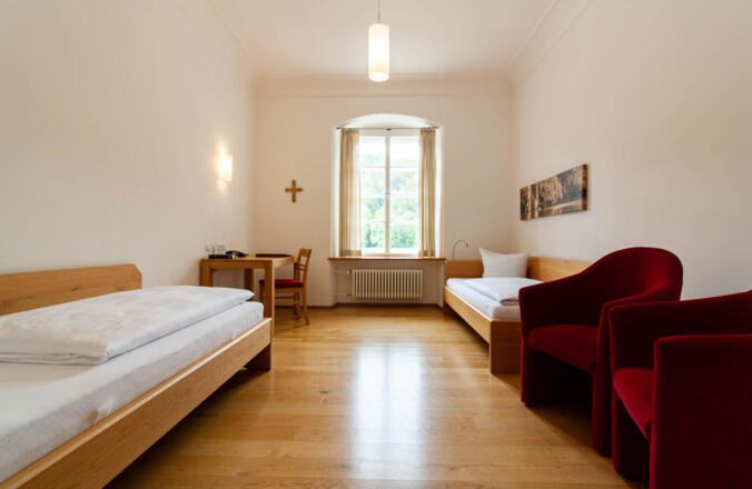 Unsere Rezeption ist in der Saison (Mai bis September) Montag bis Sonntag von 08:00 Uhr bis 18:00 Uhr besetzt. Von September bis April stehen wir Ihnen am Anreisetag bis 18:00 Uhr zur Verfügung und Sonntags nur bis 12:00 Uhr (nur Abreise) Unsere Zimmer stehen in der Regel ab 15 Uhr zur Verfügung. Die Zimmer sind am Abreisetag bis spätestens 10:00 Uhr freizugeben. Halb- oder Vollpension: Die Mahlzeiten werden in unserer Klosterküche unter Berücksichtigung von regionalen Anbietern und saisonalen Produkten täglich frisch und variantenreich zubereitet. Zusätzlich zum Frühstück vom Buffet ist auf Wunsch Halb- oder Vollpension buchbar. Bei der Halbpension servieren wir einen Hauptgang (warm / kalt), bei Vollpension zusätzlich ein 3-Gang-Mittagsmenü. Die Mahlzeiten sind: Frühstück 07:00 bis 09:30 Uhr, Mittagessen 12:10 Uhr, Abendessen 18:30 Uhr. Nicht eingenommene Mahlzeiten können nicht gutgeschrieben werden. Gerne berücksichtigen wir Verpflegungswünsche wie vegetarische oder fleischlose Kost, achten auf Unverträglichkeiten oder Allergien, wenn Sie uns diese bei Buchung mitteilen.