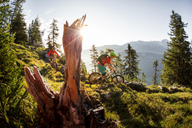 Von Unken aus entlang der Dorfstraße und dann der Forststraße bergauf bis zum Wetterkreuz. Bergab geht's über den knackigen Wetterkreuz-Trail im Salzburger Saalachtal. Dieser verläuft auf einem alten Almweg mit einmaliger Aussicht auf die Reither und Loferer Steinberge. Knapp zwei Kilometer geht es über Wurzeln und Steine hinunter, dabei sind kleine technische Herausforderungen zu meistern. Dank einer „fair play“-Lösung sind Biker sowie Wanderer auf dem neuen Trail gleichermaßen unterwegs.