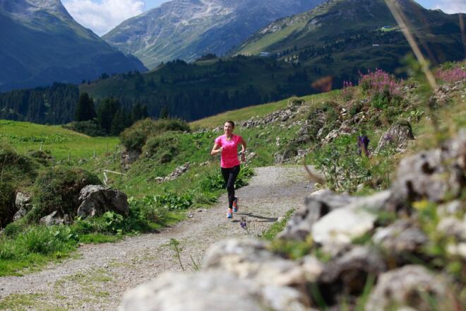 Die Jogging Strecke führt von der Postgarage den Lech aufwärts am Spar Supermarkt entlang in Richtung Omeshorn. Am Omesberg biegt man links ab auf eine breite Schotterstraße. Am Fuße des Omeshorn führt der Forstweg geht es in Richtung Gstütalpe. Nach etwa 100 Meter kommt man zur ersten Abzweigung. Wir gehen aber weiter und wählen die zweite Abzweigung links weg Richtung Wiesele. Geradeaus führt der Weg auf die Gstütalpe und zum Gipfel des Omeshorn. Der Pfad verläuft durch den Wald, direkt am Hang entlang. Links etwas weiter unten, erkennt man den Zürsbach. Der schmale Pfad ist umgeben von Latschen und mittelhohen Bäumen. Nach etwa 15 Minuten macht der Weg eine Linkskurve und führt Richtung Zürsbach bergab. Man kann schon gut eine Brücke über den Zürsbach erkennen. Wenn man den Bach überquert, führt der Weg rechts weiter nach Zürs. Wir überqueren den Bach aber nicht sondern laufen den Weg am Uferweg des Lech entlang wieder zurück nach Lech.