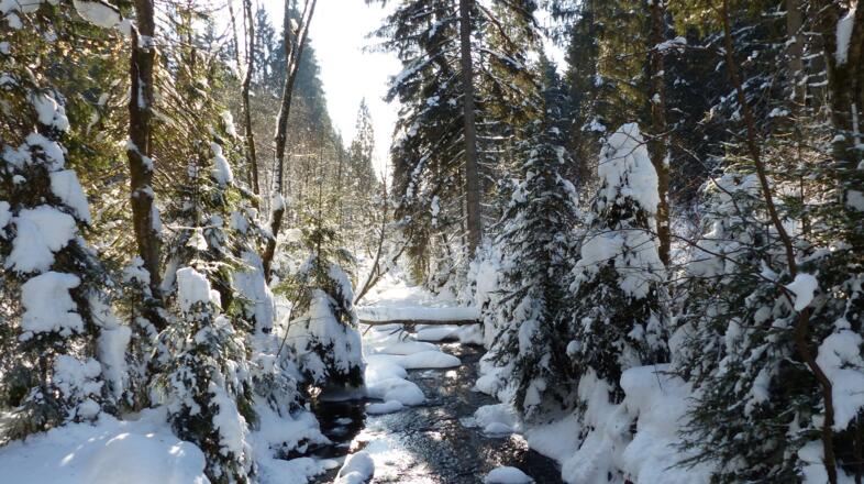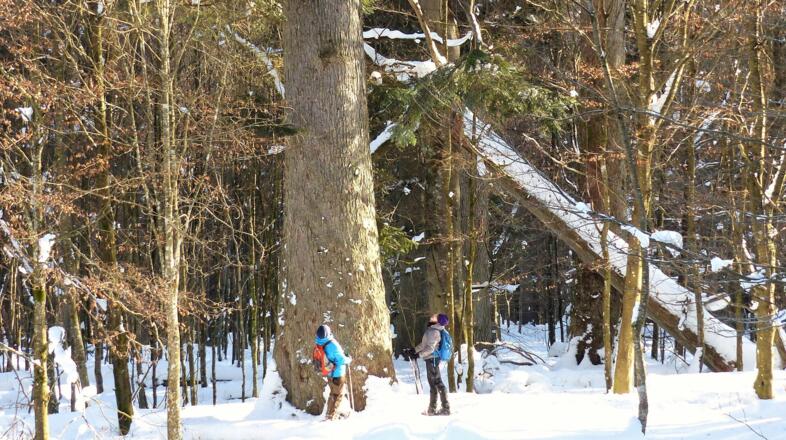 Mit Schneeschuhen geht es vom Wanderpark Bayerisch Eisenstein Richtung Schwellhäusl. Unterwegs fasziniert das Urwaldgebiet Hans-Watzlik-Hain mit der größten Tanne im Bayerischen Wald und weiteren riesigen alten Bäumen. Das Schwellhäusl lockt mit bayerisch-böhmischer Küche zur Einkehr und liegt idyllisch an der Schmalzbachschwelle. Über den Hochbergsattel und durch wilde Nationalparkwälder führt der Weg zurück nach Bayerisch Eisenstein.
