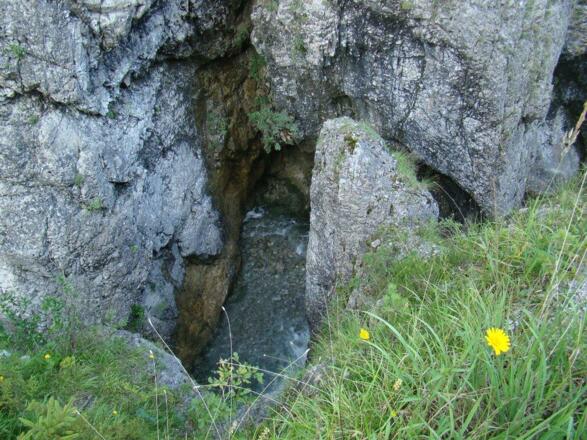 - Die Fortstraße führt weiter sanft bergauf. Jetzt wird der Gießenbach auch richtig wild und hier ist auch Vorsicht geboten, denn es geht rechter Hand tief in die Schlucht hinunter. Die Straße ist aber breit genug. Nach kurzer Zeit erreicht man wieder eine Abzweigung, bei der es rechts über eine Holzbrücke zu den Oberaudorfer Almen geht. Sie bleiben aber wie gehabt auf dem Hauptweg. Jetzt wird der Weg langsam steiniger und holpriger und es kommt eine Senke, die im Frühjahr noch als Abfluss für das Schmelzwasser dienen kann. Wer möchte kann sich kurz nach der letzten Abzweigung schon ein Plätzchen zum Verweilen suchen. Ansonsten kommt man nach ca. 500 m holprigen Weges zum Naturfreundehaus, dass aber nur selten geöffnet hat. Zurück geht es auf dem gleichen Weg.