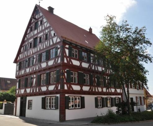 Hinter einem stilvollen Garten und den blumenberankten Galerien erheben sich über dem gemauerten Erdgeschoss zwei vorkragende Stockwerke mit qualitativ hochwertigem Fachwerk, das sich im Giebel fortsetzt. Das schlichte Erdgeschoß wird durch eine kunstvoll geschnitzte Holztür, die die Inschrift "Soli Deo Gloria" und die Jahreszahl 1697 trägt, sowie einen prächtig geschnitzten und bemalten Eckpfosten, belebt. Letzteren schützt ein origineller moderner Eckstein - auch "Hundsbrunzer" genannt - der dem Vorübergehenden die Zunge herausstreckt.