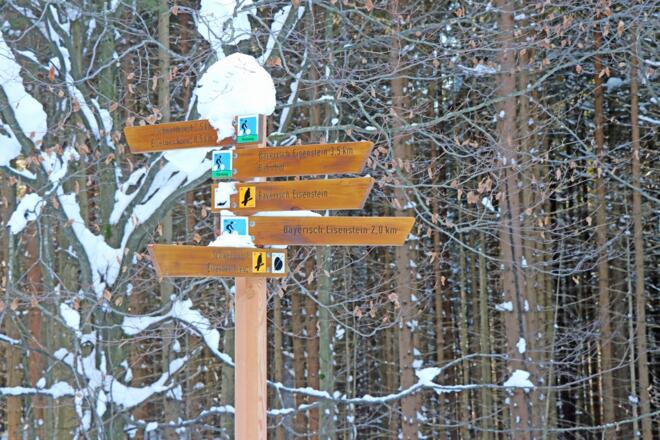 Wir starten unsere Winterwanderung in Bayerisch Eisenstein. Der Ausgangspunkt ist ideal mit der Waldbahn erreichbar, wer mit dem PKW anreist kann am Wanderpark parken. Von dort aus folgen wir dem 'Bussard' zunächst ein Stück durch den Ort und durch eine Waldbahn-Unterführung hindurch.