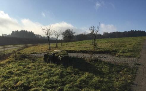 Leicht erhöht an einer Weggabel ist ein befestigter Stellplatz bei der Erinnerungstafel an die Flurbereinigung auf gut befestigter Strasse zu erreichen. Prima als Stützpunkt zum Wandern rund um Thuisbrunn