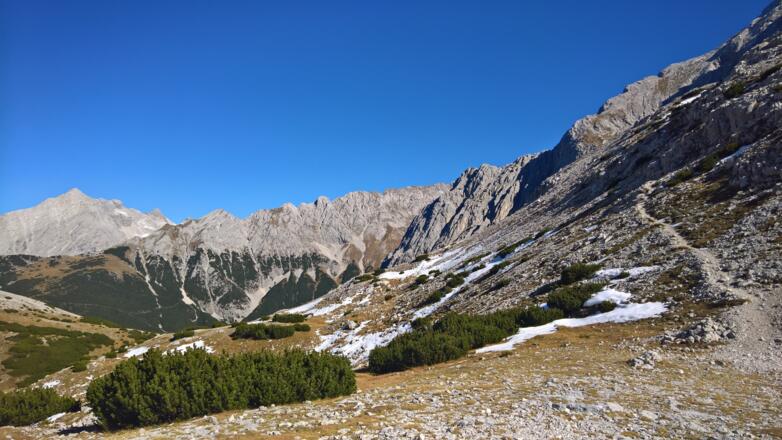 Nach einer ausgiebigen Rast und genießen der Aussicht geht es von der Bettelwurfhütte geht es über den Normalweg Nr. 222 wieder retour in das Halltal.