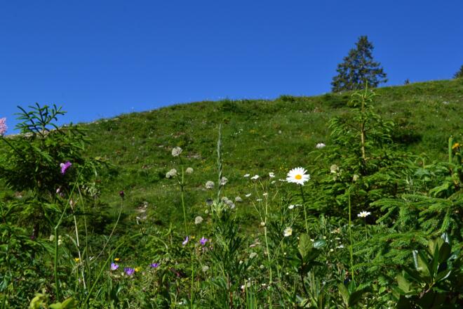 Schöner Weg zur Ifenhütte durch Wald und Wiesen. Der 2017 angelegte Naturpfad leitet durch ein Blumenmeer mit Waldabschnitten und vorbei an Kuhherden.