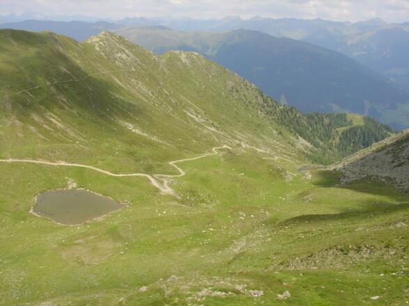 In weiterer Folge wandert man über den Demut (2592m) und weiter zum Eisenreich (2665m), dem höchsten Punkt der Wanderung. Der Abschnitt zwischen den beiden Gipfeln erfordert Trittsicherheit, stellt für geübte Wanderer aber kein Problem dar. Vom Eisenreich sieht man bereits das Tagesziel und der leichte Abstieg zur Obstansersee Hütte ist bald geschafft. Der See nahe der Hütte lädt zum Erfrischen ein, wer lieber trocken bleibt kann sich auch ein Tretboot leihen und den See befahren.